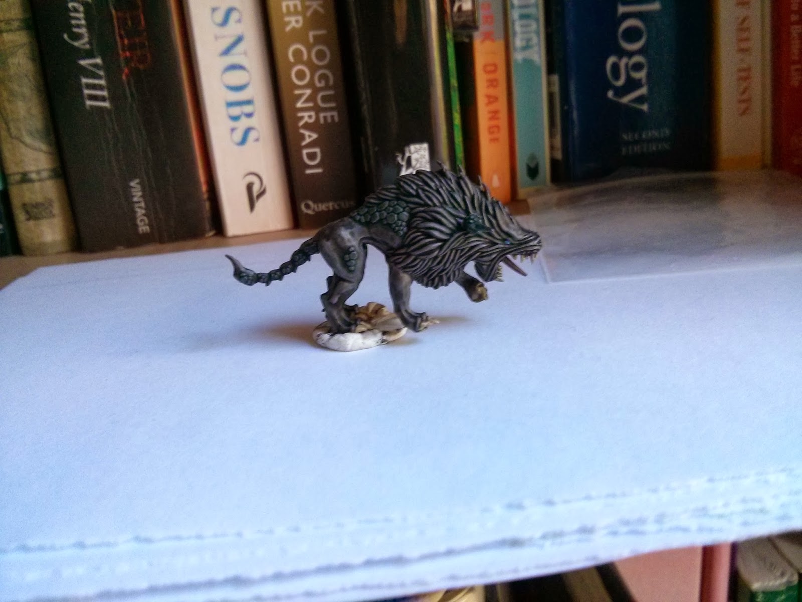 The hounds show how the shading of simply a wash over the grey undercoat can work. They have simply had a wash of Badab Black (GW paint, updated to Nuln Oil) and that really nicely gives depth to the colour, darkening the light grey, adding a bit of character. They will receive another black wash to darken them some more, but also a green wash to show the marshy environment that they live in. I'm not sure what colour to paint their eyes though - red would be a classic option, but possibly the bright light blue might make them glow and stand out. Also I need to work out what to do on the horns/spines and teeth/mouths.